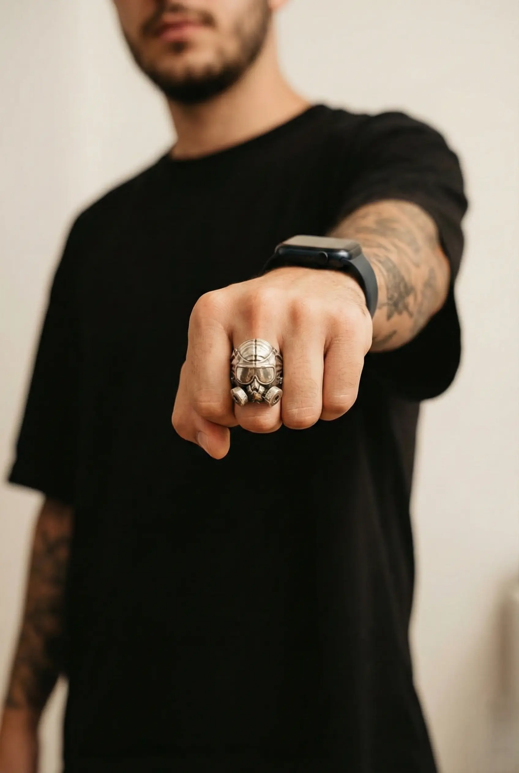 Descubre el anillo “inspirado” en Mute, una pieza que lleva la máscara icónica de Mute directamente a tu mano. Un diseño auténtico que combina detalles intrincados y una presencia imponente.
